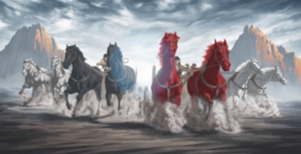 Nous avons presque la même image que celle des cavaliers apocalyptiques dans le chapitre six de l'Apocalypse, à savoir un cheval blanc, un cheval rouge, un cheval noir et un cheval tacheté, qui équivaut à un cheval pâle. L'identité de ces chevaux est expliquée par un ange dans le chapitre 6:4-5 du livre de Zacharie.